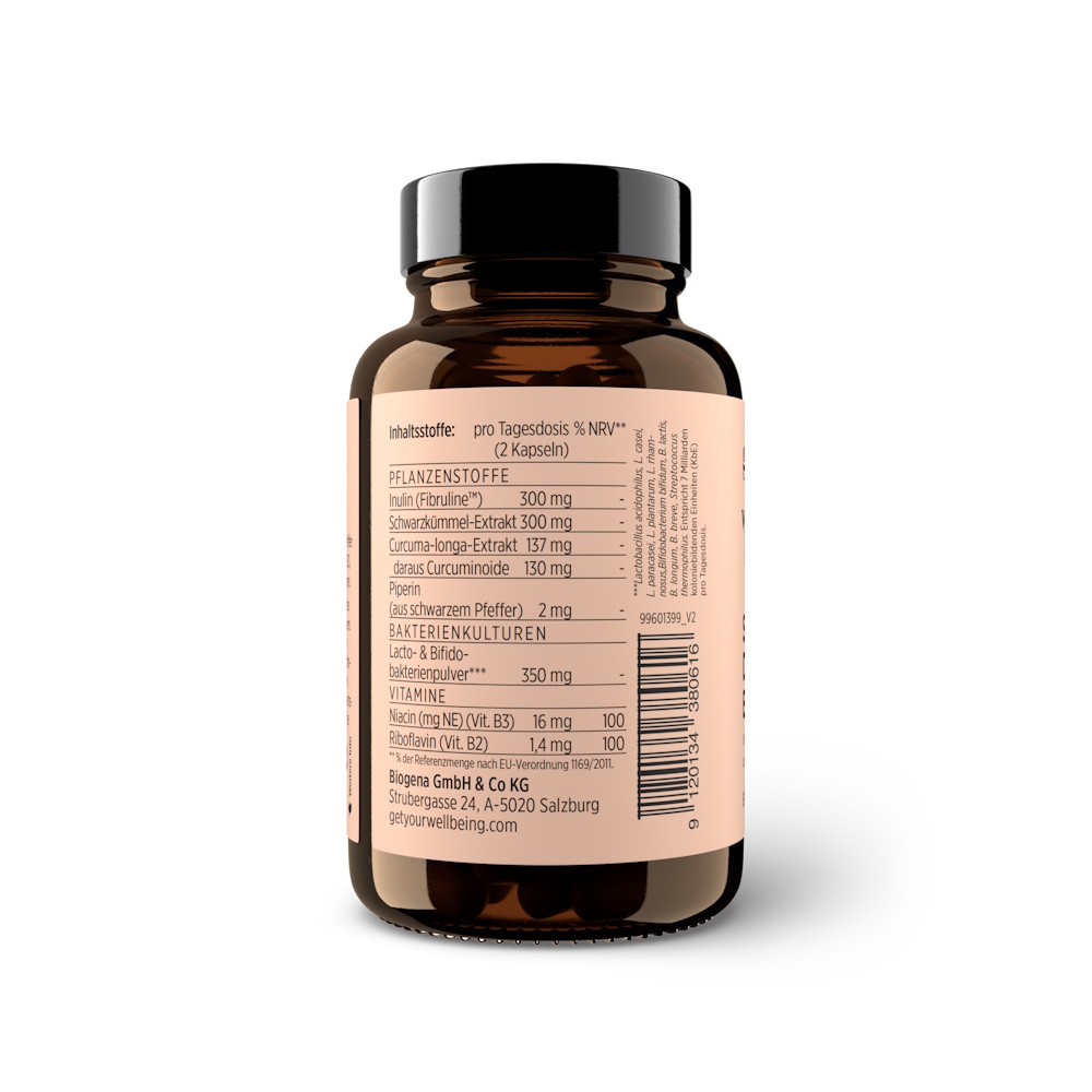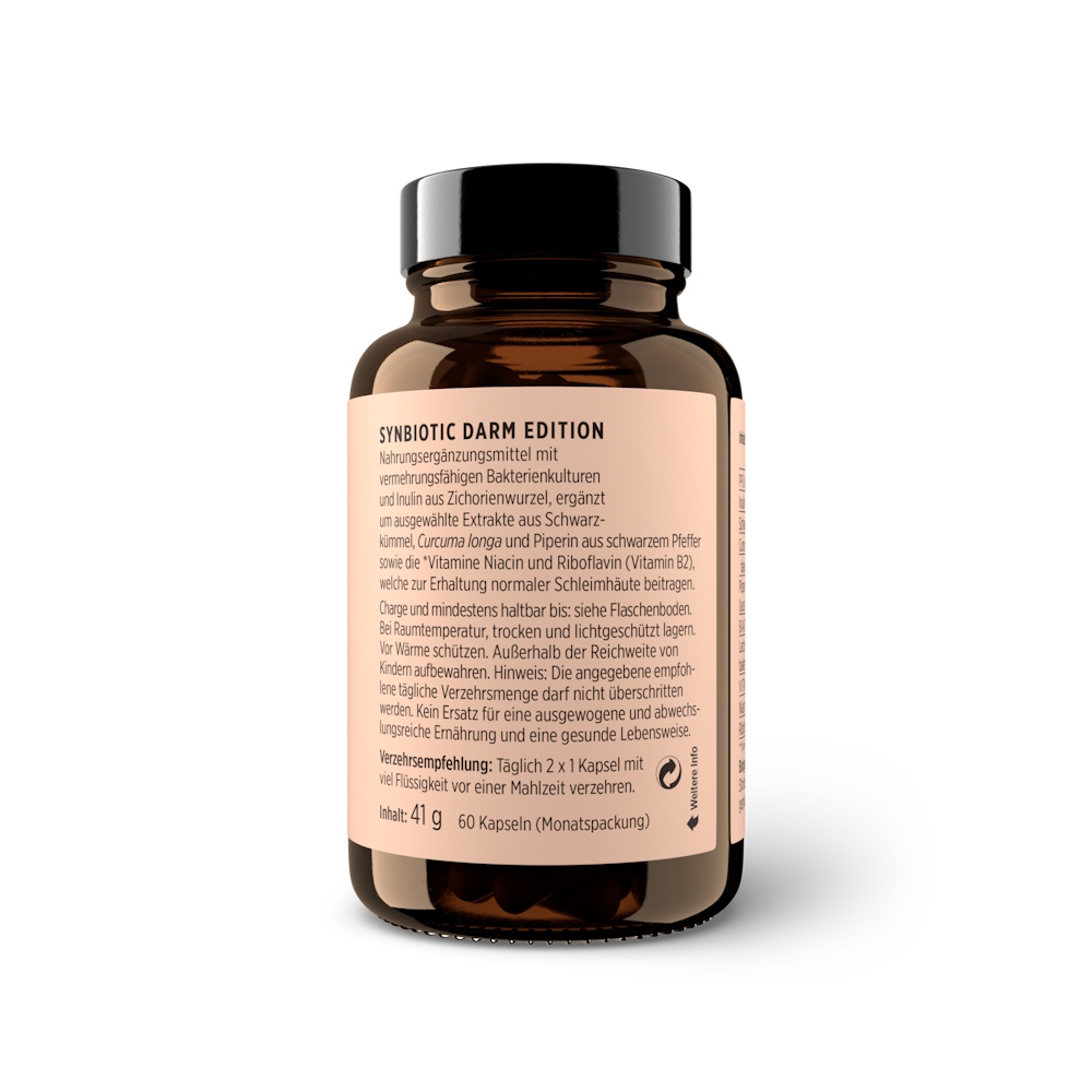 СИНБИОТИЧКОТО ЦРЕВНО ИЗДАНИЕ обезбедува балансирана комбинација од одржливи бактериски култури и инулин од корен од цикорија, дополнето со одбрани екстракти од црн ким, куркума лонга и пиперин од црн пипер, како и *витамините ниацин и рибофлавин (витамин Б2), кои придонесуваат за одржување на нормални мукозни мембрани.